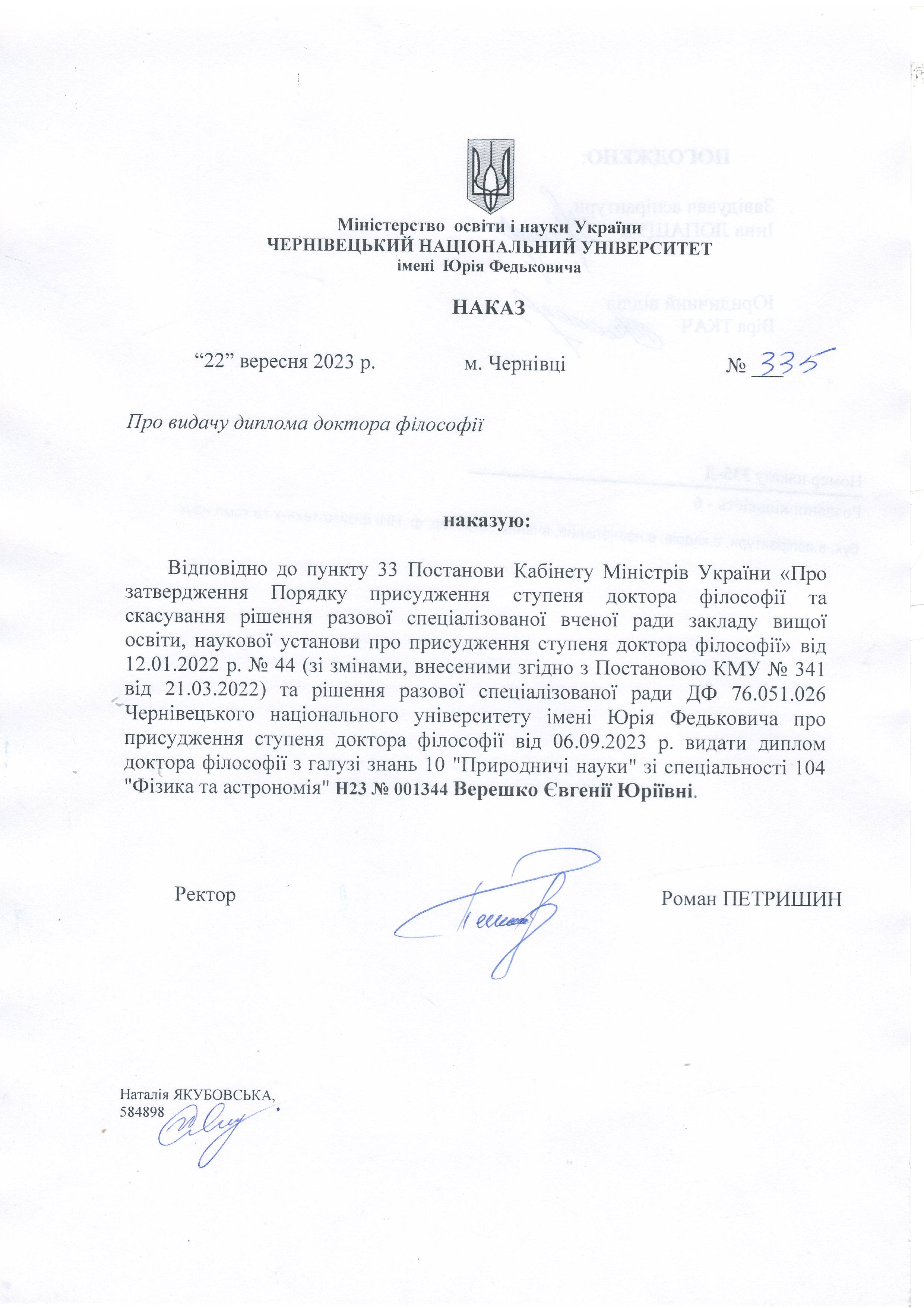 Здобувач наукового ступеня доктора філософії: Верешко Євгенія Юріївна